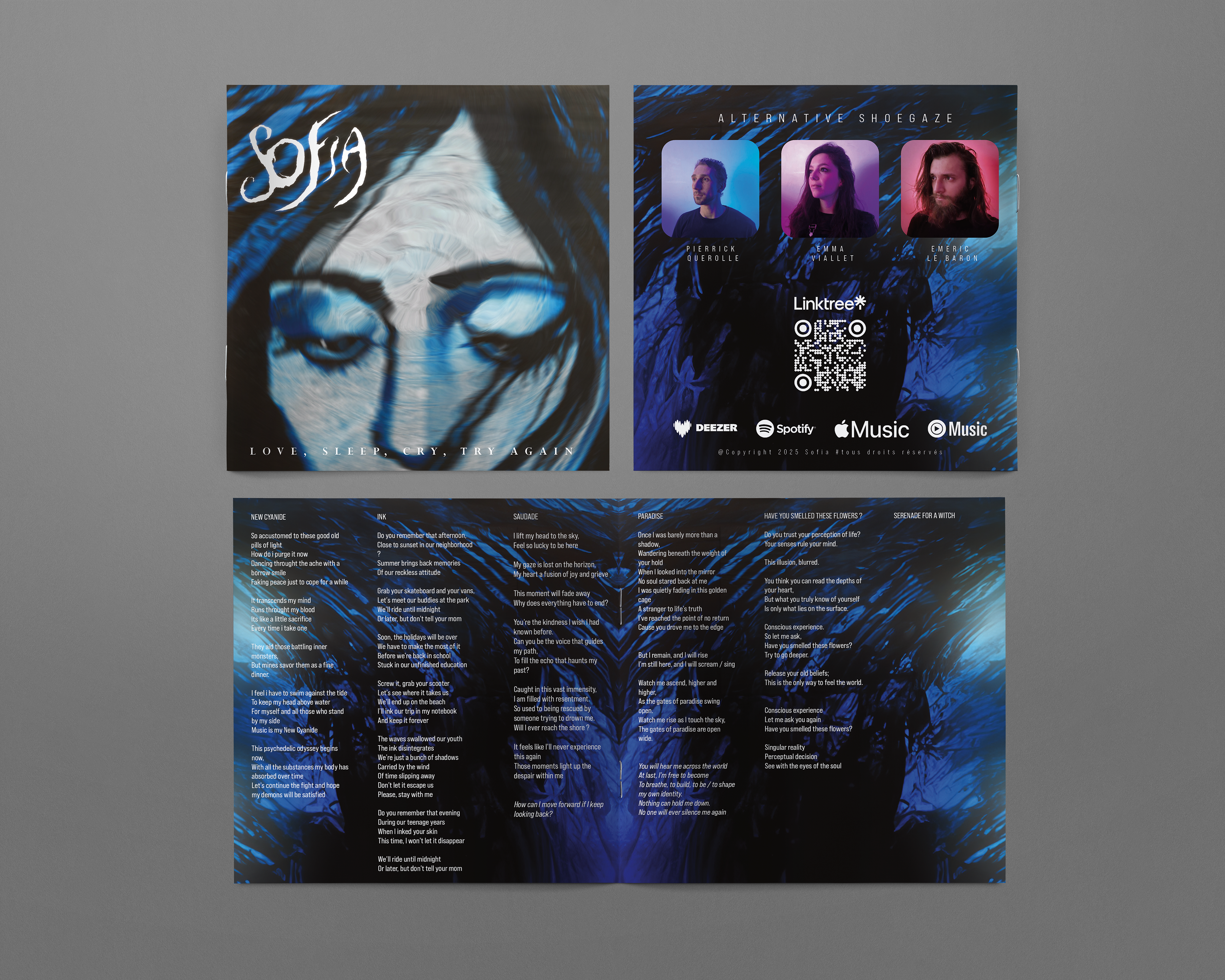 Projet pour Sofia, groupe de shoegaze de Clermont-Ferrand. Le but était d’accompagner le groupe et de créer des visuels en accord avec leur univers et leurs chansons. Une mélancolie mêlée à une nostalgie à la fois brutale et douce. C’est auprès d’Emeric Le Baron, membre fondateur du groupe, que j’ai travaillé tout en proposant de nouvelles créations originales. Merci à lui pour la confiance qu’il m’a accordée.